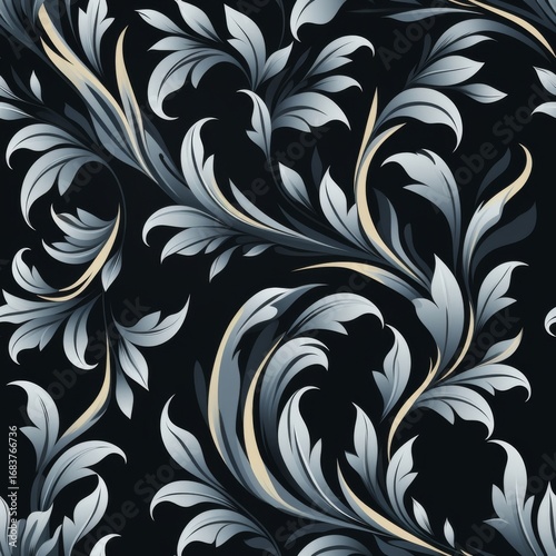 An elegant seamless floral motif design with stylized leaf patterns in monochromatic grays whites and touches of yellow