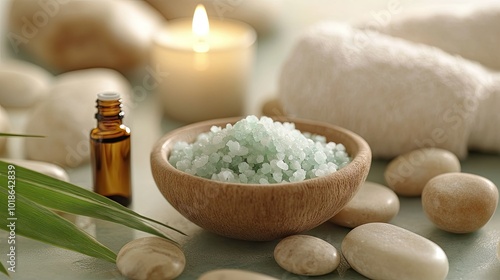 An elegant spa composition with herbal bath salts, a candle, and a small bowl of essential oils, all set against a backdrop of smooth stones.