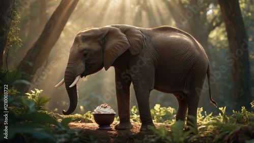 An elephant stands beside a bowl of ice cream in a sunlit forest.