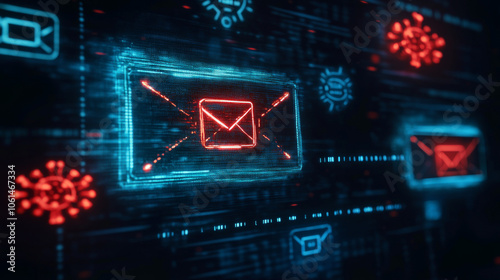 An email inbox shows a spam virus warning. It also displays icons for email security, new messages, and internet communication. The concept includes the risk of junk mail and compromised information.