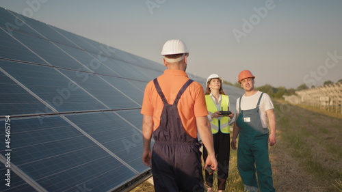 An employee of a solar power plant talks on a walkie-talkie while his colleagues and an investor check the solar power plant with an infrared scanner, a drone. Photovoltaic solar panel installation