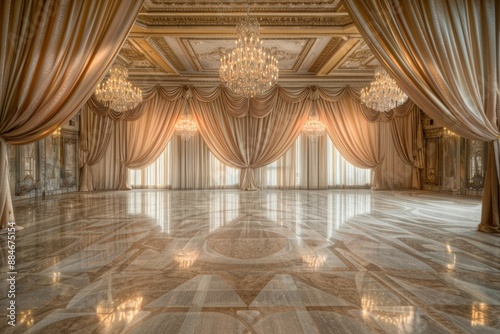 An empty ballroom, with a marble floor, crystal chandeliers above, and luxurious draped curtains.