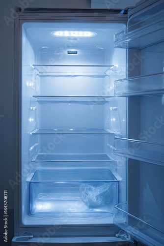 An empty, brightly lit refrigerator with open door, showcasing clear shelves, crisper drawer, and internal LED lighting