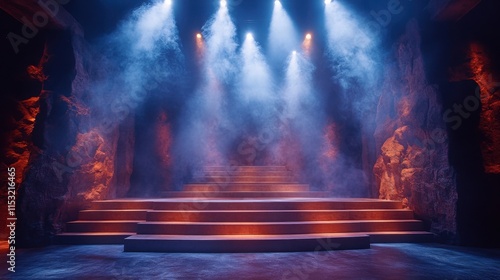 An empty concert podium awaits performers on an illuminated stage filled with steam and spotlights, perfect for showcasing fashion talent during a night event