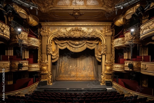 An empty, elegant theater with gold curtain ready to start a show. None in the seats. Concept: Nobody goes to the theatre. Generative ai