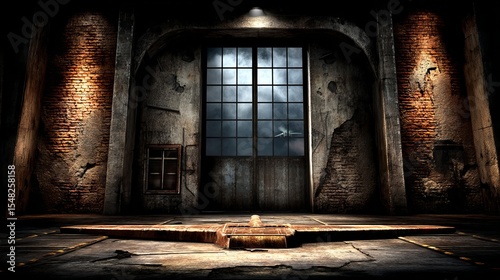 An empty industrial hangar interior with large window and brick walls, illuminated by subtle lighting