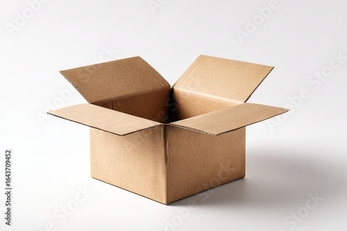 An empty, light brown cardboard box sits open on a white background, showing its square shape and slightly shadowed interior