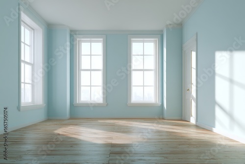 An empty light-filled room with pale blue walls, showcasing large windows, and a wooden floor.