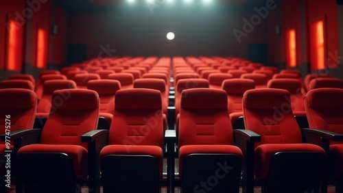 An empty modern cinema theater featuring comfortable red seats with an illuminated screen, evoking memories of the excitement and anticipation of movie experiences.