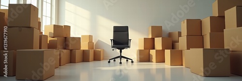 An empty office space featuring a swivel chair surrounded by moving boxes, symbolizing change and transition in a professional environment.
