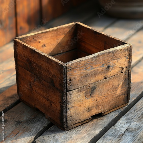 An empty rustic wooden crate sits on a wooden surface. The crate is square and made of aged wood showing its grain and wear.