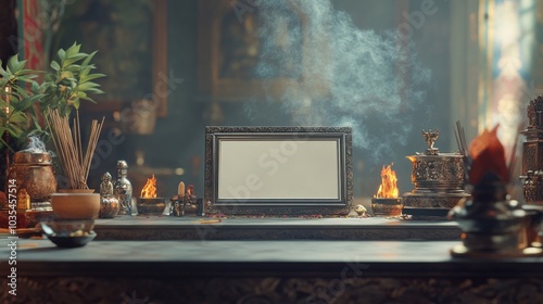 An empty scene featuring blank mockup template (surrounded by photos of the departed in ornate silver frames and burning incense sticks),