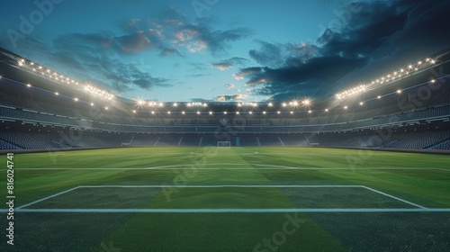 An empty stadium at dusk, spectacular lighting, shadows and reflections on the field
