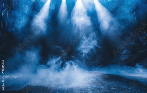 An empty stage engulfed in fog with dramatic blue lighting, creating an atmosphere of suspense and anticipation.