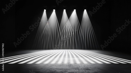An empty stage illuminated by dramatic spotlights, casting striking shadows on a textured floor, creating a captivating atmosphere.