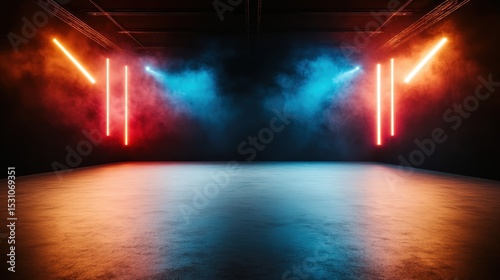 An empty stage illuminated by vibrant blue and orange lights, creating an atmospheric backdrop ideal for performances, concerts, and imaginative artistic expressions.