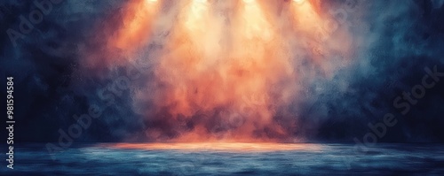 An empty theater stage blanketed in a thick veil of smoke, with bright spotlights piercing through the mist, creating sharp, dramatic beams of light that cut through the darkness, evoking a sense of