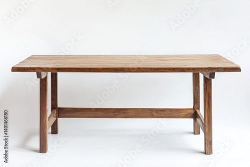 An empty wooden table against a white background, offering a perfect space for text or image placement