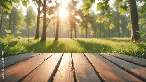 An empty wooden table used for product display, with a blurred natural green park background, sunny, featuring a blurred abstract garden landscape advertisement and a simulated space concept.