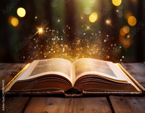 an enchanted book lies open on a rustic wooden table radiating golden light and sparkling magic from its pages evoking feelings of wonder and mystery