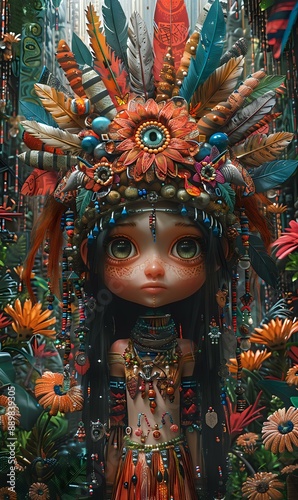 An enchanting digital art piece featuring a whimsical character adorned with a vibrant headdress made of feathers and flowers. Ideal for fantasy, art, and creative content.