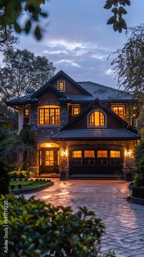 An enchanting twilight scene of a charming suburban home, with the warm evening light illuminating its inviting facade, manicured garden, and welcoming garage entrance.