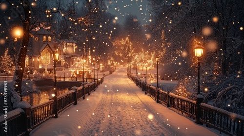 An enchanting Winter Wonderland featuring a charmingly snowy pathway adorned with warm lights