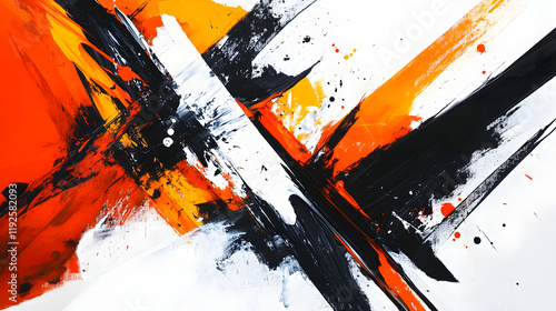 An energetic abstract artwork of sharp, angular brushstrokes in bold shades of black, orange, and white, suggesting movement and power