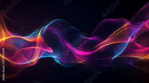 An energetic digital wallpaper with neon-colored particle waves forming abstract shapes and patterns against a black background