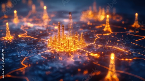 An energy infrastructure network is illustrated with refineries at the core, symbolizing the demand-driven energy matrix.
