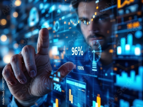 An engaging close-up image of a man interacting with a digital display showing key business metrics, including clocks, ticks, and percentage data.