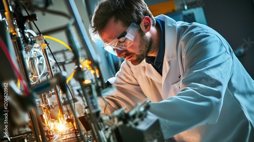An engineer in a lab coat and safety goggles conducting experiments on renewable energy sources in a state-of-the-art research laboratory, Renewable energy research lab scene