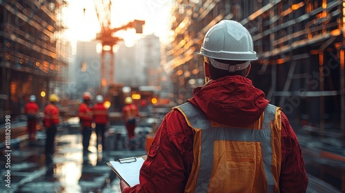 An engineer in a white hard hat gives directions to workers at a construction site, surrounded by scaffolding and cranes, ensuring safety and efficiency