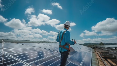 An engineer is working on checking and maintaining solar batteries near solar panels on a sunny day at a solar power plant station