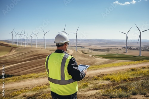 An engineer uses a program on a laptop to inspect the wind turbine landscape.