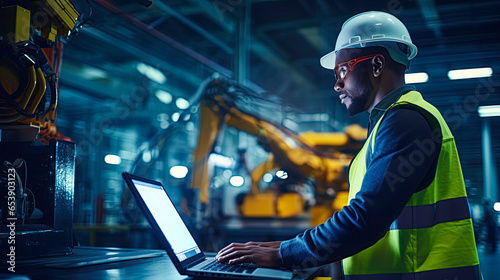 An engineer wearing a hard hat and safety vest is operating a laptop in an industrial setting with heavy machinery in the background.