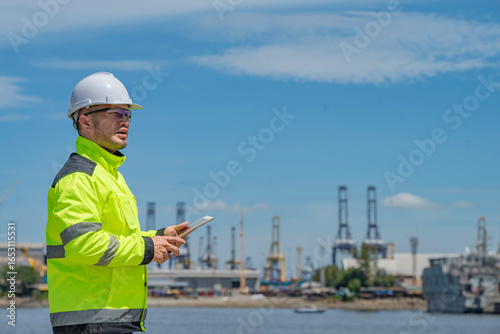 An engineer works at a busy shipping port, inspecting containers and managing logistics operations, ensuring smooth import and export processes with safety and efficiency in global trade.