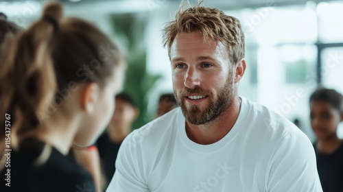 An enthusiastic man with a beaming smile, wearing a white shirt, actively engages with young participants during a gym session, emphasizing positivity and communication.