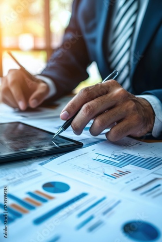 An entrepreneur calculating revenue growth on a tablet while seated in a bright office