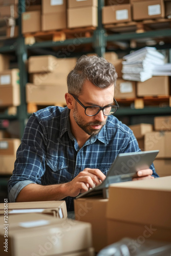 An entrepreneur calculating taxes on a digital device, warehouse boxes background
