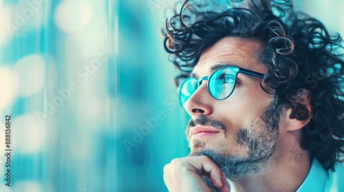 An entrepreneur in a modern office setting, deep in thought while looking out the window, symbolizing vision and leadership in business. The image offers ample copy space for adding text or graphics.