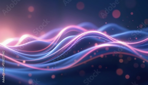 An ethereal, abstract landscape unfolds in a deep, cosmic blue, featuring gently undulating waves illuminated by a soft