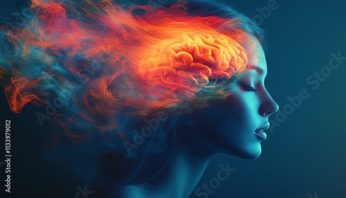 An ethereal portrait of a woman with a colorful, abstract brain explosion, blending artistic creativity into a bold blue atmosphere