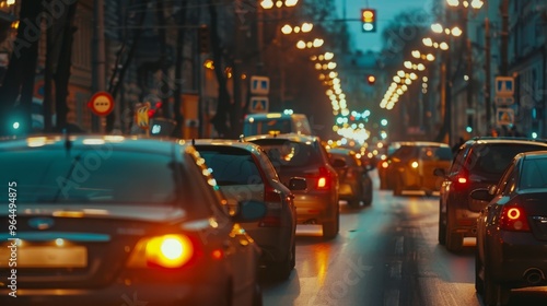 An evening traffic scene on a lively urban avenue, with a long line of cars and illuminated streetlights accentuating the vibrant city life.