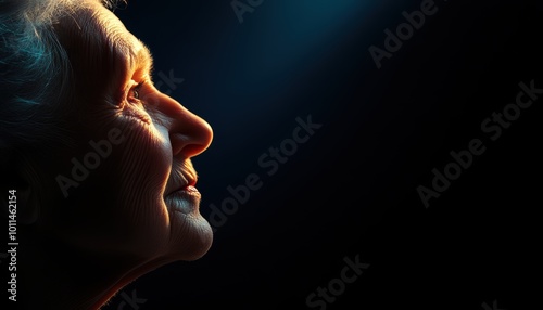 An evocative profile of an elderly woman, illuminated by soft light, capturing the beauty and depth of age, reflecting a lifetime of experiences and emotions.