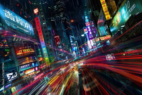 An evocative wallpaper illustration featuring a bustling cityscape during a summer thunderstorm, with lightning flashing across the sky and rain pouring down, Generative AI