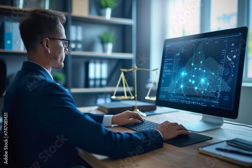 An executive reviews a complex digital network graph in a modern office, highlighting data analytics and technology