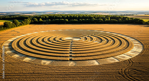 An expansive aerial view captures a complex geometric crop circle design meticulously etched into a ripe golden wheat field The sunlit pattern contrasts with a distant treeline and a hazy sky