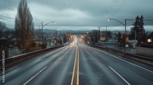 An expansive city street, painted shiny with rain, extends endlessly into a moody skyline, capturing the quiet anticipation before the city awakens.