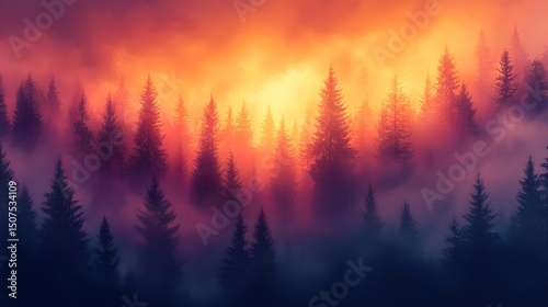 An expansive enchanted misty forest under a vivid gradient twilight sky capturing the mystical allure of nature